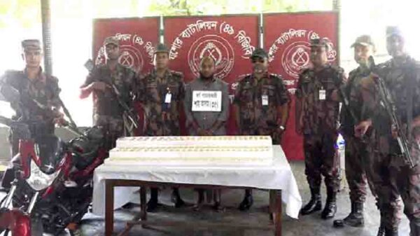 যশোরের চৌগাছা সীমান্তে কৃষকের ছদ্মবেশে ১২৪ পিস স্বর্ণের বার ভারতে পাচার করতে গিয়ে শাহ আলম (৩৫) নামে এক ব্যক্তি আটক হয়েছেন। ৭ম বার পাচার করার সময় ১০ কোটি ১১ লাখ