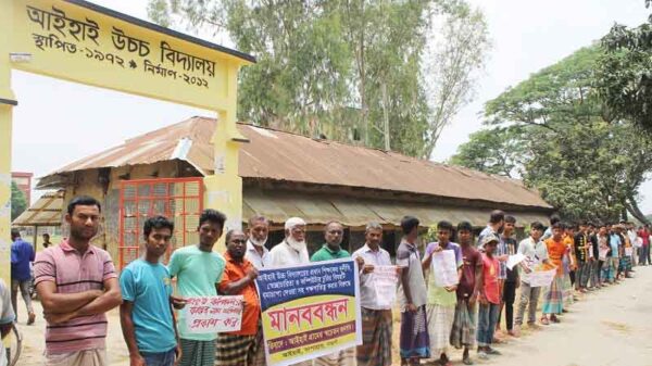 নওগাঁর সাপাহার উপজেলার আাইহাই উচ্চ বিদ্যালয়ের প্রধান শিক্ষকের বিরুদ্ধে মানববন্ধন অনুষ্ঠিত হয়েছে। সোমবার বেলা ১১টায় বিদ্যালয় গেটের সামনে মানববন্ধনে অংশনেন বিদ্যালয়ের প্রাক্তন ছাত্র, এলাকার অভিভাবক ও সচেতনমহল। প্রধান শিক্ষকের বিরুদ্ধে