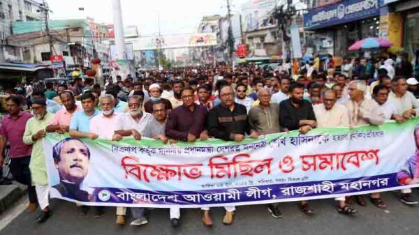 বিএনপি কর্তৃক মাননীয় প্রধানমন্ত্রী দেশরত্ন শেখ হাসিনাকে প্রাণনাশের হুমকির প্রতিবাদে রাজশাহী মহানগর আওয়ামী লীগের উদ্যোগে বিক্ষোভ মিছিল অনুষ্ঠিত হয়েছে। শনিবার (৪ জুন) বিকাল ০৫টায় কুমারপাড়ার দলীয় কার্যালয় থেকে বিক্ষোভ মিছিল